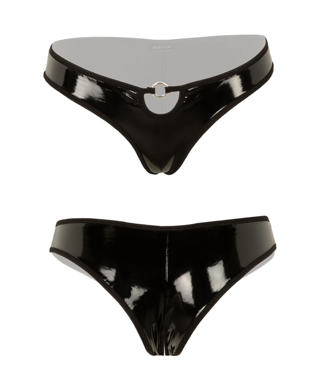 Trusene er laget i elastisk stoff som legger seg tett inntil kroppen og fremhever hver eneste deilige detalj. De frekke detaljene gir en edgy look, og det spesielle belegget gir trusene en luksuriøs og unik glans. Det anbefales å vaske og oppbevare trusene separat fra annen klesvask for å bevare glansen.