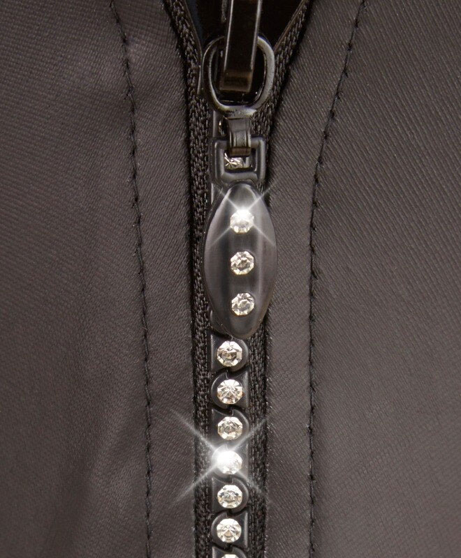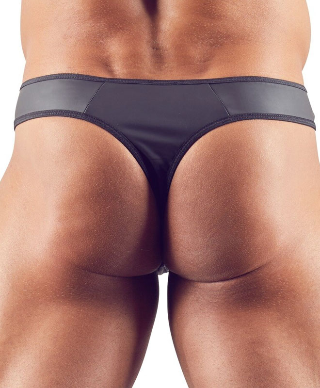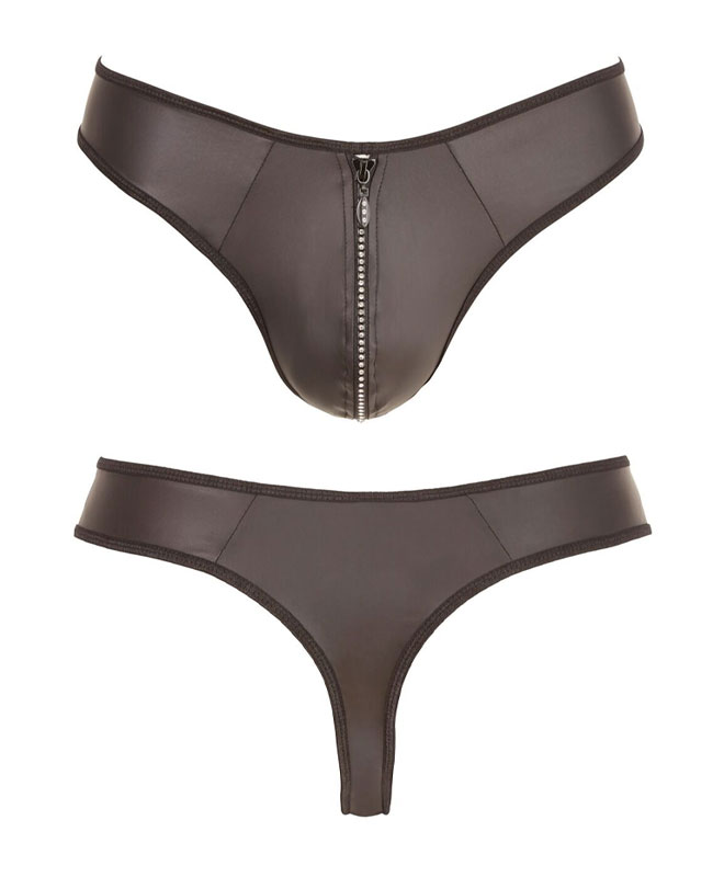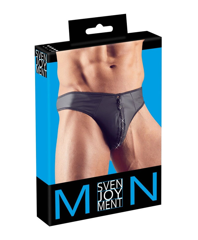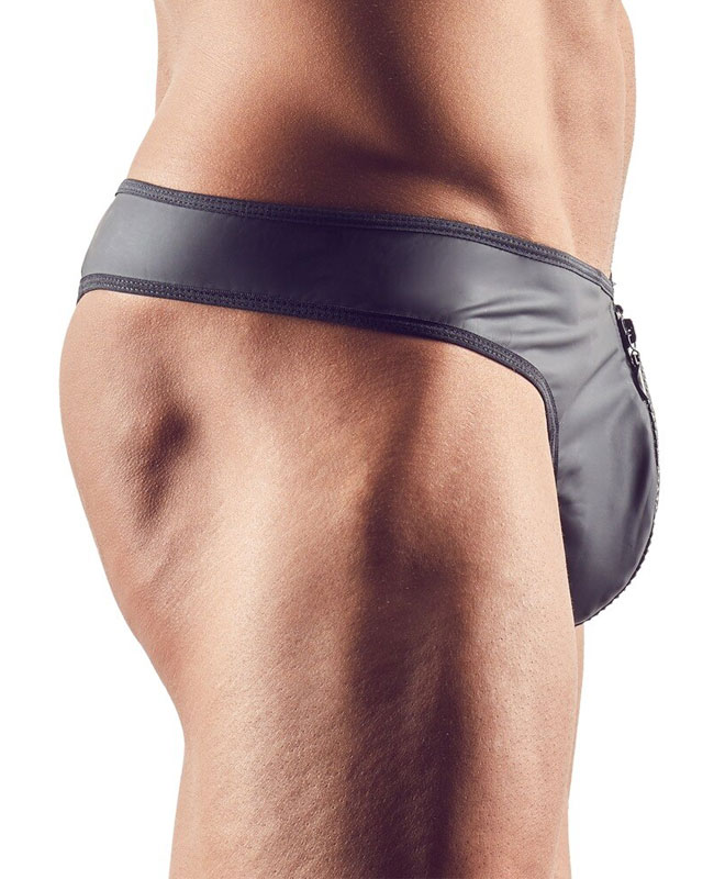 For mannen som liker litt ekstra bling. Denne svarte stringen sitter tett, viser akkurat nok og gir en deilig følelse med én gang. Stoffet er mykt og fleksibelt, og legger seg rundt kroppen uten å presse, bare fremheve de riktige stedene. Og ja: glidelåsen foran, pyntet med små blanke steiner, trekker blikket rett der du vil.