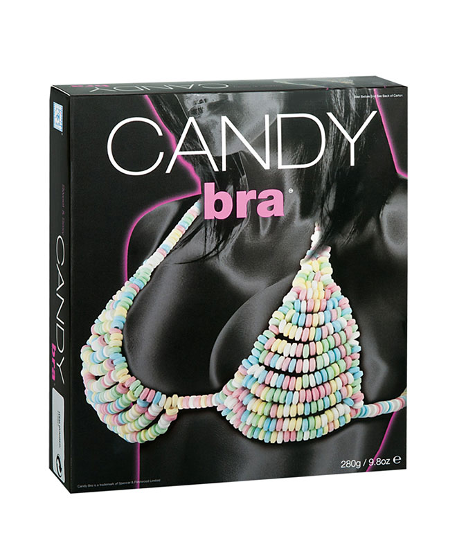 Smakfull BH laget av sukkertøy! Spis eller slikk de små godbitene til du når den virkelige desserten - hennes deilige bryster! BHen er elastisk og passer de fleste.