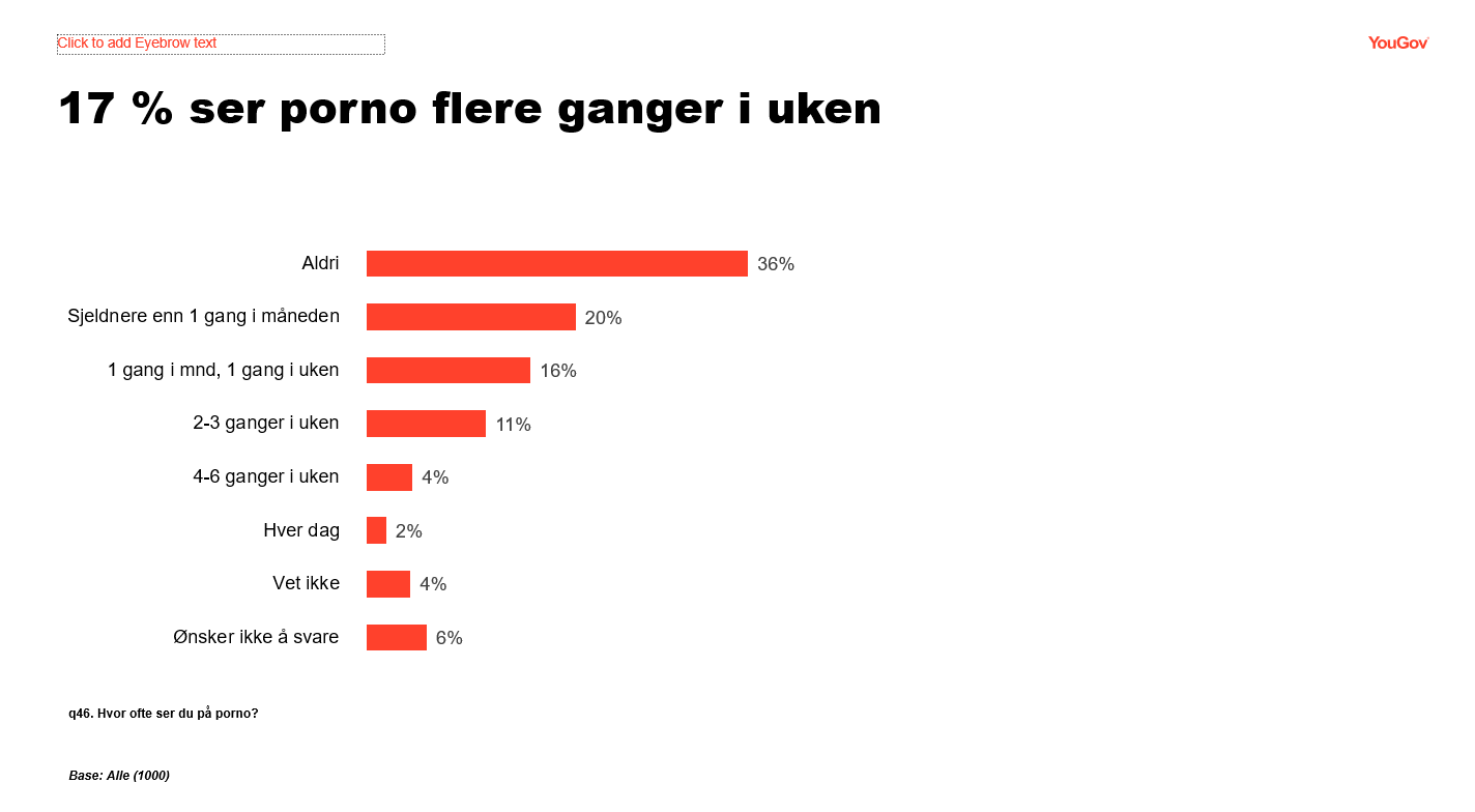 I Norge ser 17% porno flere ganger i uken. Det kommer frem i en ny undersøkelse gjennomført av YouGov for Nytelse.no. I samme undersøkelse kommer det også frem av de fleste bruker porno når de onanerer, både for inspirasjon, underholdning og å få orgasme raskere.