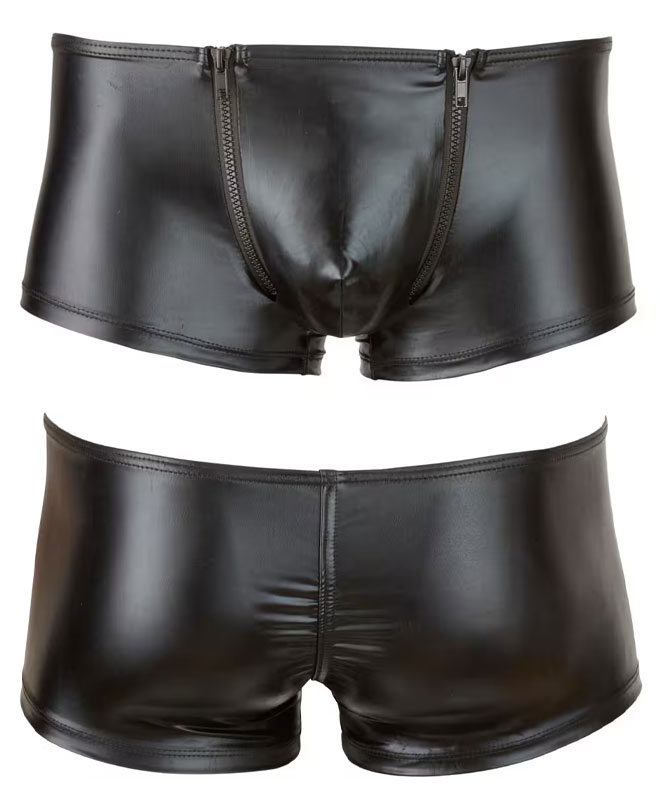 Foran har du to glidelåser, én på hver side av pungen, som åpner seg akkurat når stemningen krever det. Rask tilgang, null stress. Bak har bokseren en markert søm som gir en rund og tydelig fasong – perfekt når du vil at rompa skal få litt ekstra oppmerksomhet. Den er laget for kvelder som kan skli ut, klubb, rollespill eller når du bare vil være litt farligere enn vanlig.