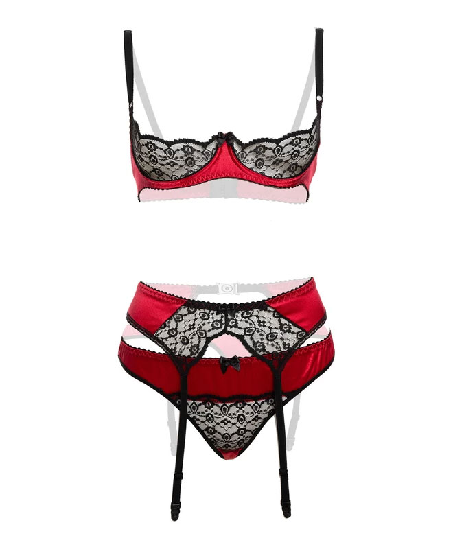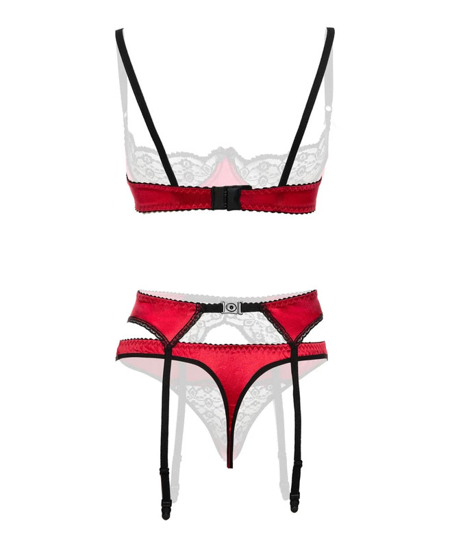 Ohlala! Dette tredelte undertøysettet fra Christine le Duc er både forførende og lekent. Den røde BH-en med trekvartskopper har lekre, sorte blondedetaljer og bøyler som gir støtte og en uimotståelig, utfordrende look. Den åpne fasongen lar brystene dine være delvis synlige, sånn at du kan overlate litt til fantasien.