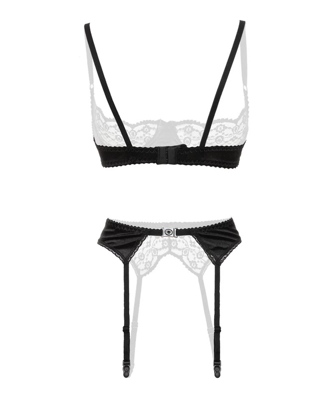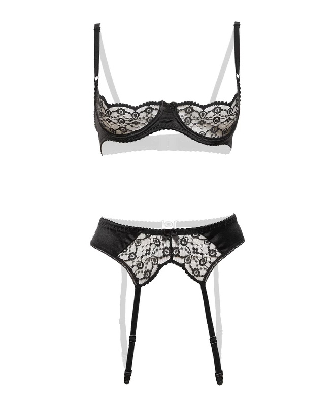 Dette spennende settet fra Christine er perfekt for deg som liker undertøy som gir det lille ekstra! BH-en har trekvartskopper i myk blonde, og bøyle under som gir god støtte og fremhever bysten på en deilig måte. Settet inkluderer en matchende hofteholder og en sexy stringtruse, som sammen skaper en forførende og leken look. Settet har justerbare stropper som gir overlegen passform og suveren komfort, her er det bare å kose seg! NB: Strømper er ikke inkludert.