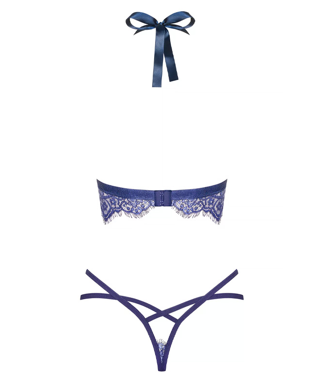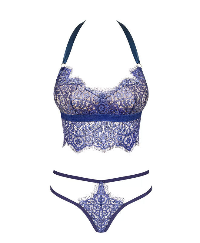 Klar for å kle deg i noe som faktisk føles sexy? Dette undertøyssettet fra Obsessive kombinerer lekre blå blonder med en kroppsnær passform. BH-en har et langline-design med blomstrete blonder og en liten knytesløyfe i nakken, som gir en feminin og samtidig litt frekk silhuett. Den matchende trusen har dobbelt stroppedetalj over hoftene for den lille ekstra prikken over i-en.