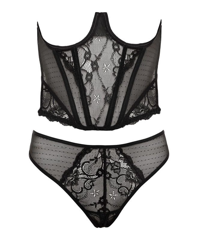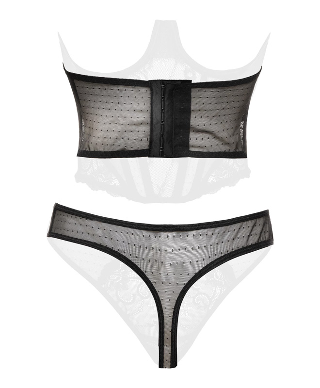 Dette forførende underbystekorsettet kombinerer blonder og transparent materiale for en uimotståelig look! Korsettet har seks formstaver som fremhever midjen og gir en deilig og kroppsnær passform. Kortsettet har lukking med hemper bak som er enkle å justere for optimal passform og komfort. Det følger også med en matchende stringtruse! Dette blir garantert en ny favoritt.