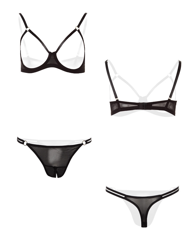Et undertøysett du ikke glemmer med det første! BH-en har åpne kopper og justerbare stropper som fremhever bysten og gir en frekk look. Settet har elastisk materiale som former seg etter kroppen og sørger for behagelig passform og komfortabel bruk. Det følger med en matchende sexy stringtruse, hva mer kan man ønske seg?