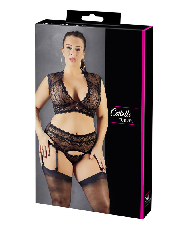Dette undertøysettet i sorte blonder fra Cottelli Collection Plus er både sexy og veldig komfortabelt! Hvem sa at man ikke kunne få i både pose og sekk?